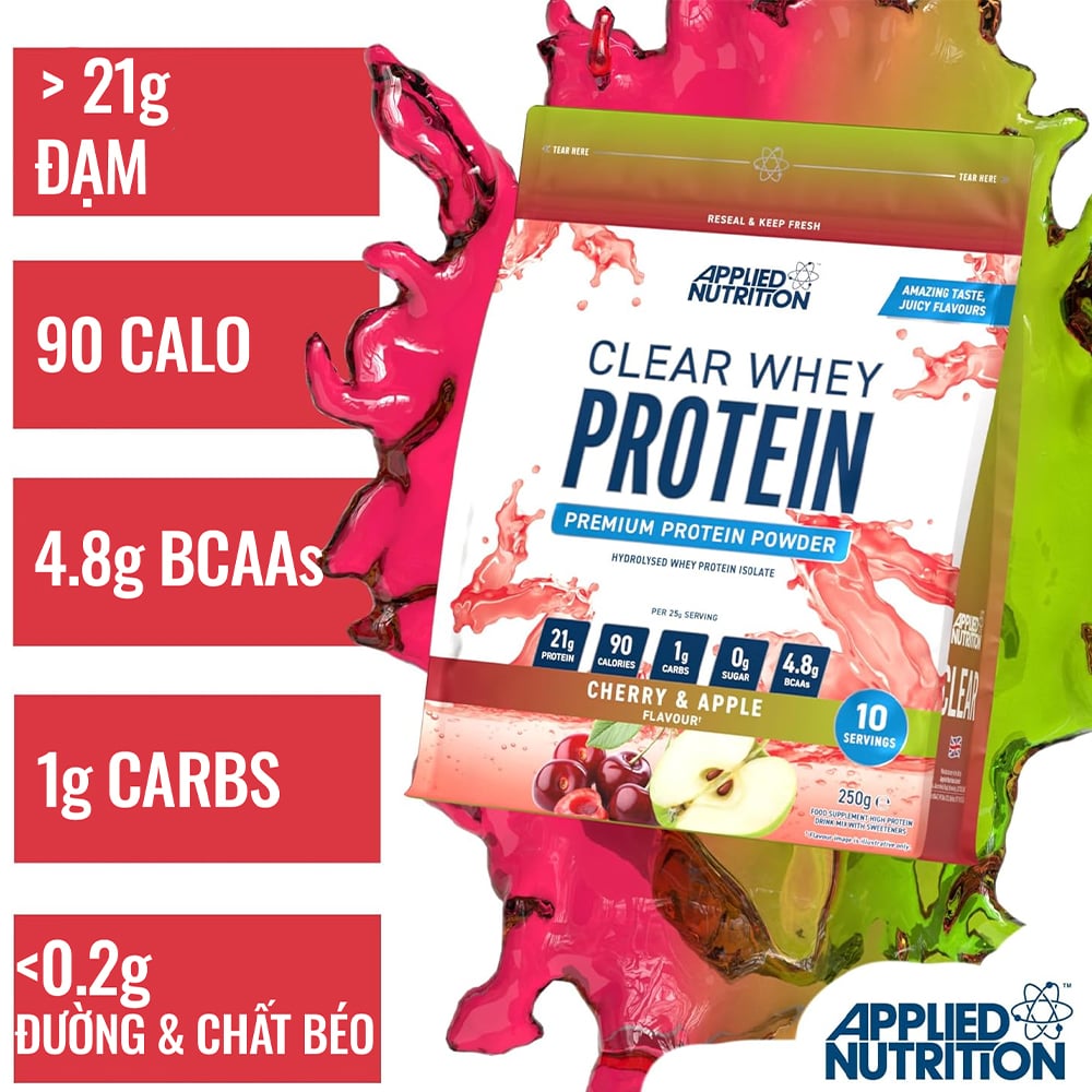 Clear Whey Protein là sản phẩm whey protein của thương hiệu Applied Nutrition - 250g / 10 lần dùng, cung cấp nguồn protein chất lượng cao từ ultra-hydrolyzed whey protein isolate hay còn gọi whey siêu thủy phân có độ tinh khiết cao giúp hấp thu nhanh, hiệu quả. Hiện nay, Applied Nutrition Clear Whey Protein có hương vị được tách hoàn toàn vị sữa, vị trái cây thơm ngon, tự nhiên, sảng khoái giống như nước ép trái cây.