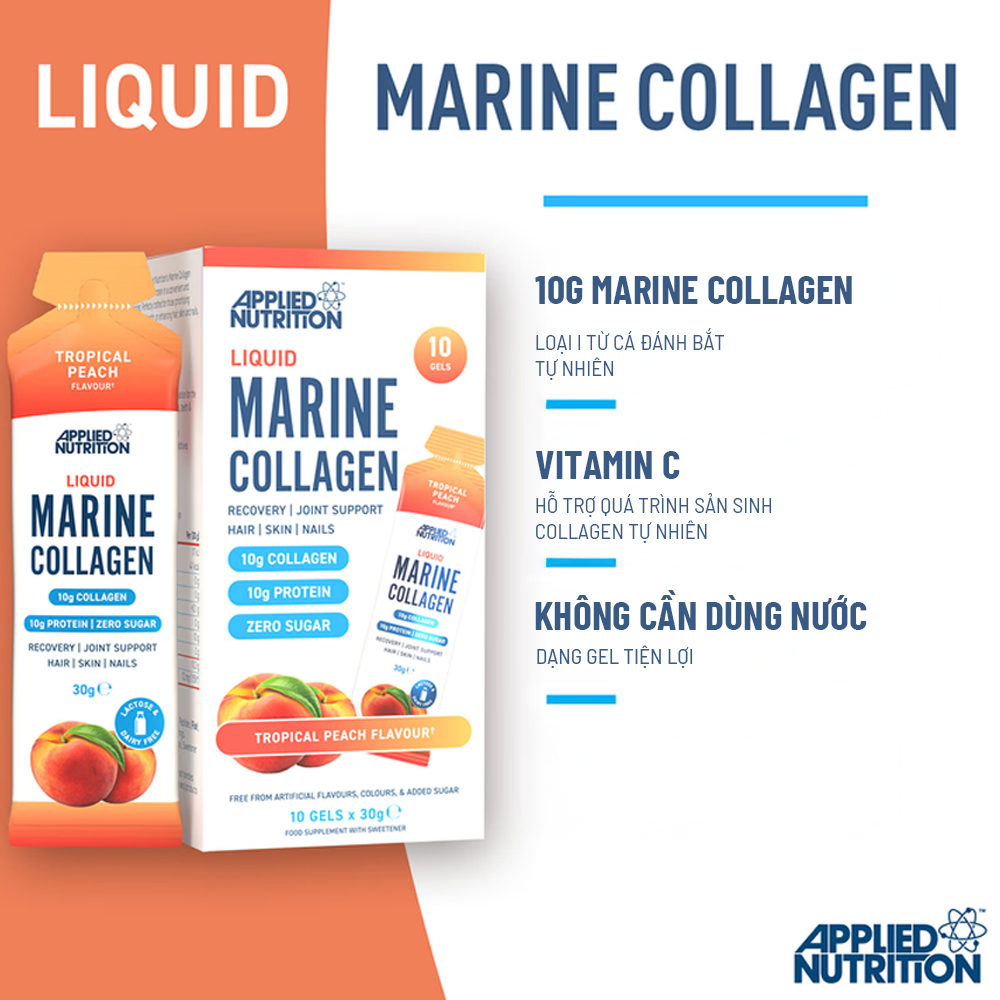 Applied Nutrition Liquid Marine Collagen dạng lỏng uống liền cực kỳ tiện lợi. Mỗi gói chứa 10g Marine Collagen Peptides (collagen thủy phân) chất lượng cao từ cá biển sâu tự nhiên và 10g protein giúp tái tạo độ đàn hồi, trẻ hóa làn da, nuôi dưỡng tóc móng mà còn hỗ trợ duy trì sự linh hoạt, dẻo dai, hỗ trợ xương khớp.