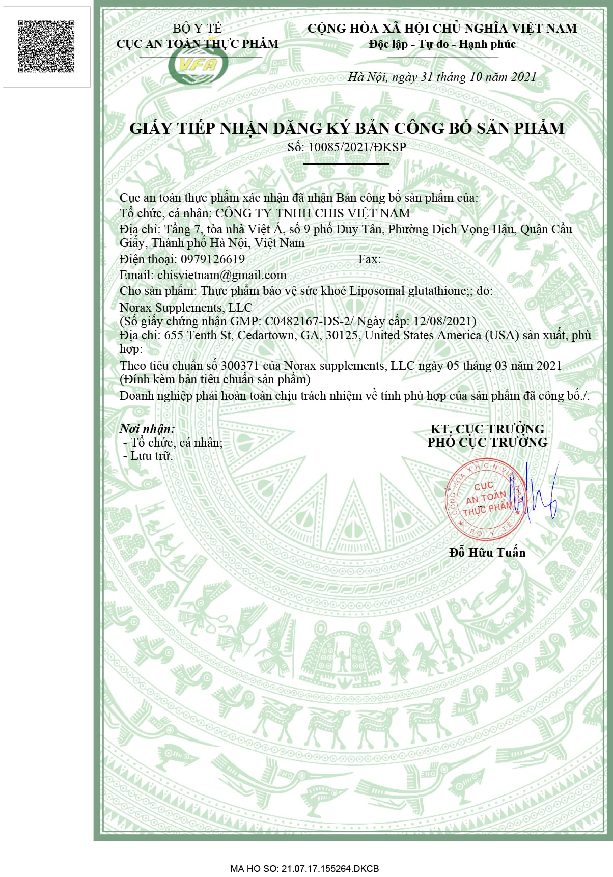 Giấy tiếp nhận đăng kí công bố sản phẩm số: 10085/2021/ĐKSP