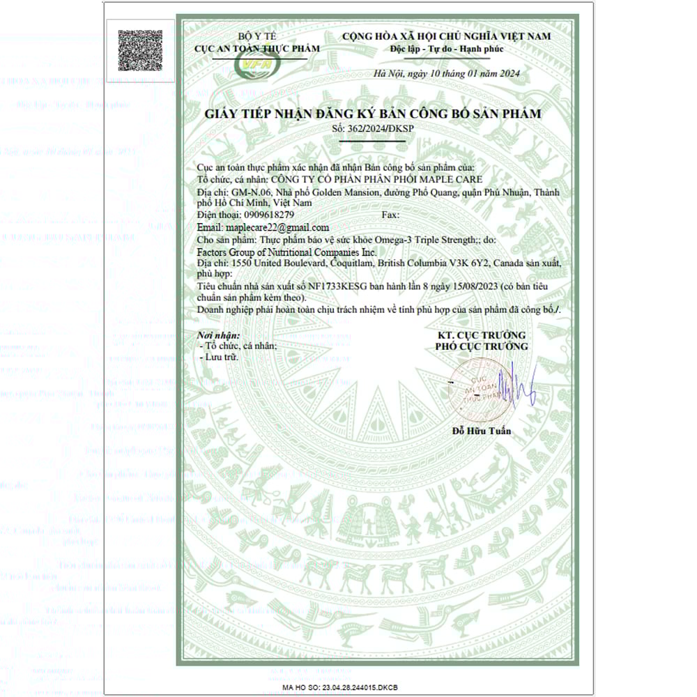 | Thành phần chính | - Dầu cá cô đặc* (cá cơm, cá mòi hoặc cá thu) - 1425mg - Axit béo Omega-3 - 900mg Trong đó: + Axit Eicosapentaenoic (EPA) - 600mg + Axit docosahexaenoic (DHA) - 300mg |