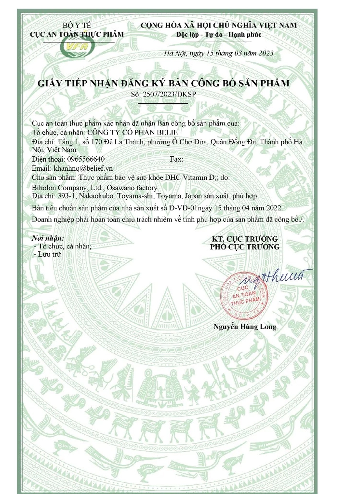 ✅ Giấy tiếp nhận đăng kí công bố sản phẩm số: 2807/2023/ĐKSP