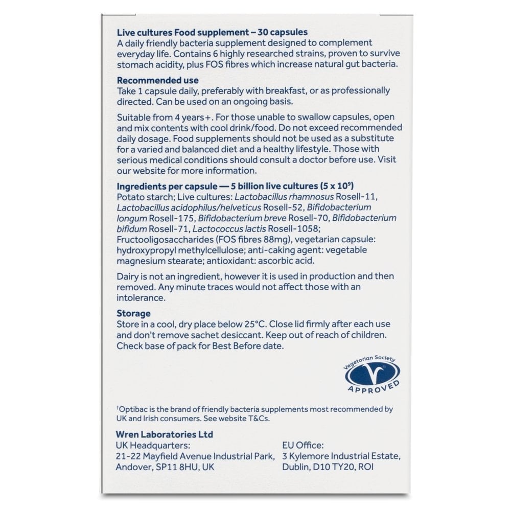 Mỗi viên Optibac Everyday cung cấp 5 tỷ CFU (Colony Forming Units - đơn vị hình thành khuẩn lạc), đảm bảo đến thời điểm hết hạn. Sản phẩm không chứa gluten, sữa, đường và phù hợp với người ăn chay.