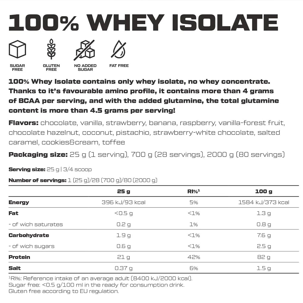 Scitec Nutrition 100% Whey Protein Isolate cung cấp nguồn protein tinh khiết, hấp thu nhanh, giúp nuôi dưỡng và phục hồi cơ bắp tối ưu sau tập luyện. Với hàm lượng protein cao cùng lượng chất béo và đường thấp, sản phẩm đặc biệt phù hợp cho người đang trong giai đoạn siết cơ hoặc ăn kiêng.
