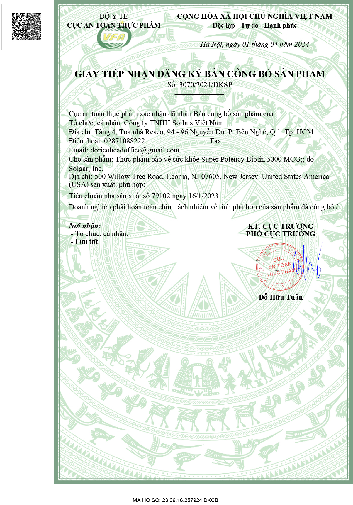 Giấy tiếp nhận đăng kí công bố sản phẩm số: 2070/2024/ĐKSP