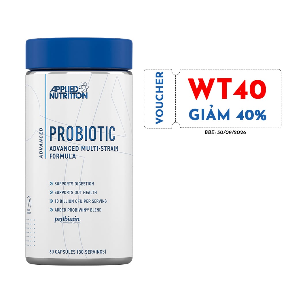 Applied Nutrition Probiotic 60 Viên cung cấp 10 tỷ CFU (Colony Forming Units) từ 10 chủng lợi khuẩn chọn lọc kèm 200 mg FOS (Prebiotic) mỗi serving — công thức đa chủng hỗ trợ hệ vi sinh đường ruột từ Applied Nutrition (Anh Quốc). Chính hãng tại Whey Tốt.