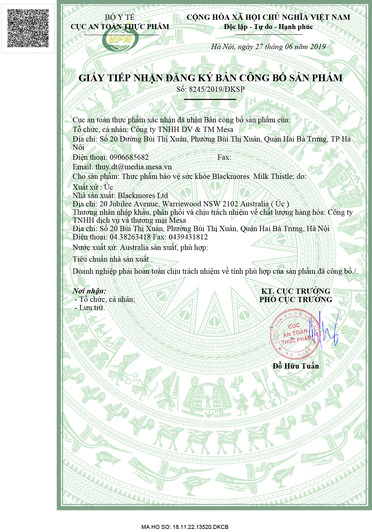 ✅ Giấy tiếp nhận đăng kí công bố sản phẩm số: 8245/2019/ĐKSP